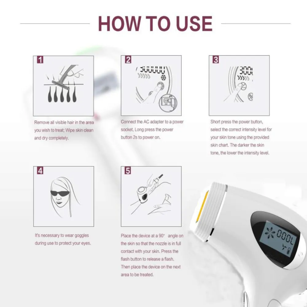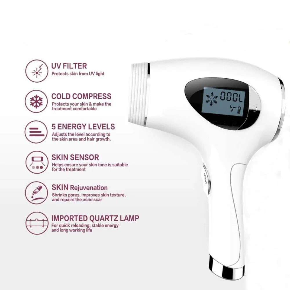 • Ice-cooling laser hair removal device: This laser hair removal device offers two separate heads for laser hair removal and painless ice care, making it an extraordinary IPL hair removal device. The ice care head provides a cooling sensation to reduce adverse skin reactions and makes the laser hair removal experience painless and fast.